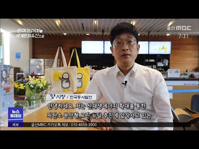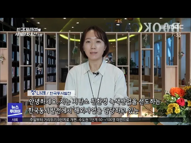 정나래/한국동서발전 안녕하세요. 저는 저탄소 친환경 녹색산업을 선도하는 한국동서발전에서 해외사업을 담당하고 있는 정나래입니다. 울산 이전 초기에는 주말에 뭘 할까 많이 고민도 됐었고요. 그래서 반구대 암각화나 간절곶, 태화강 같은 명소들은 지인들의 추천으로 많이 방문을 했었고요. 특히 인상 깊었던 장소 중...
