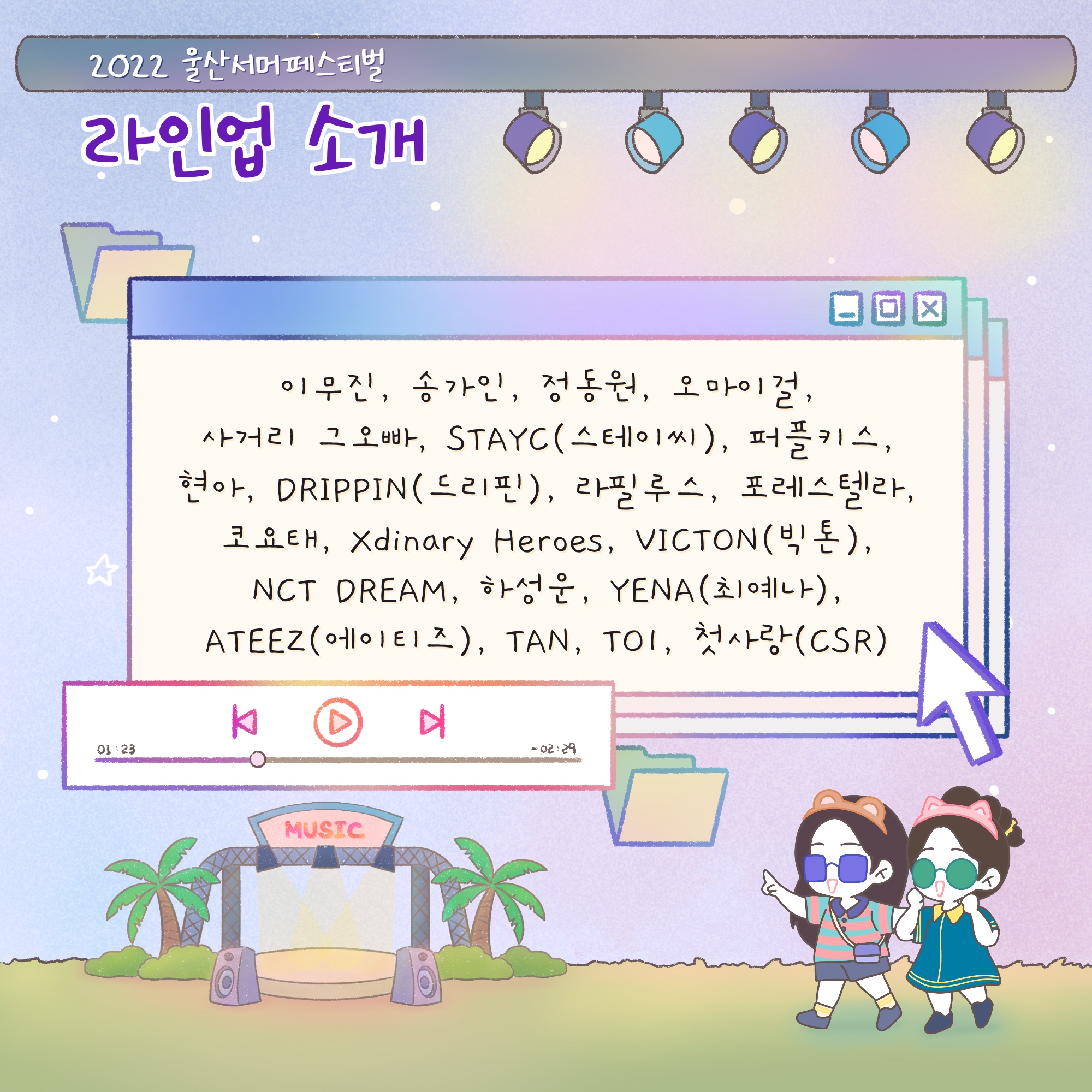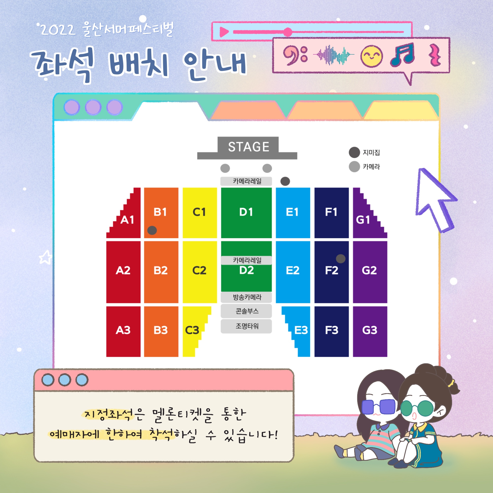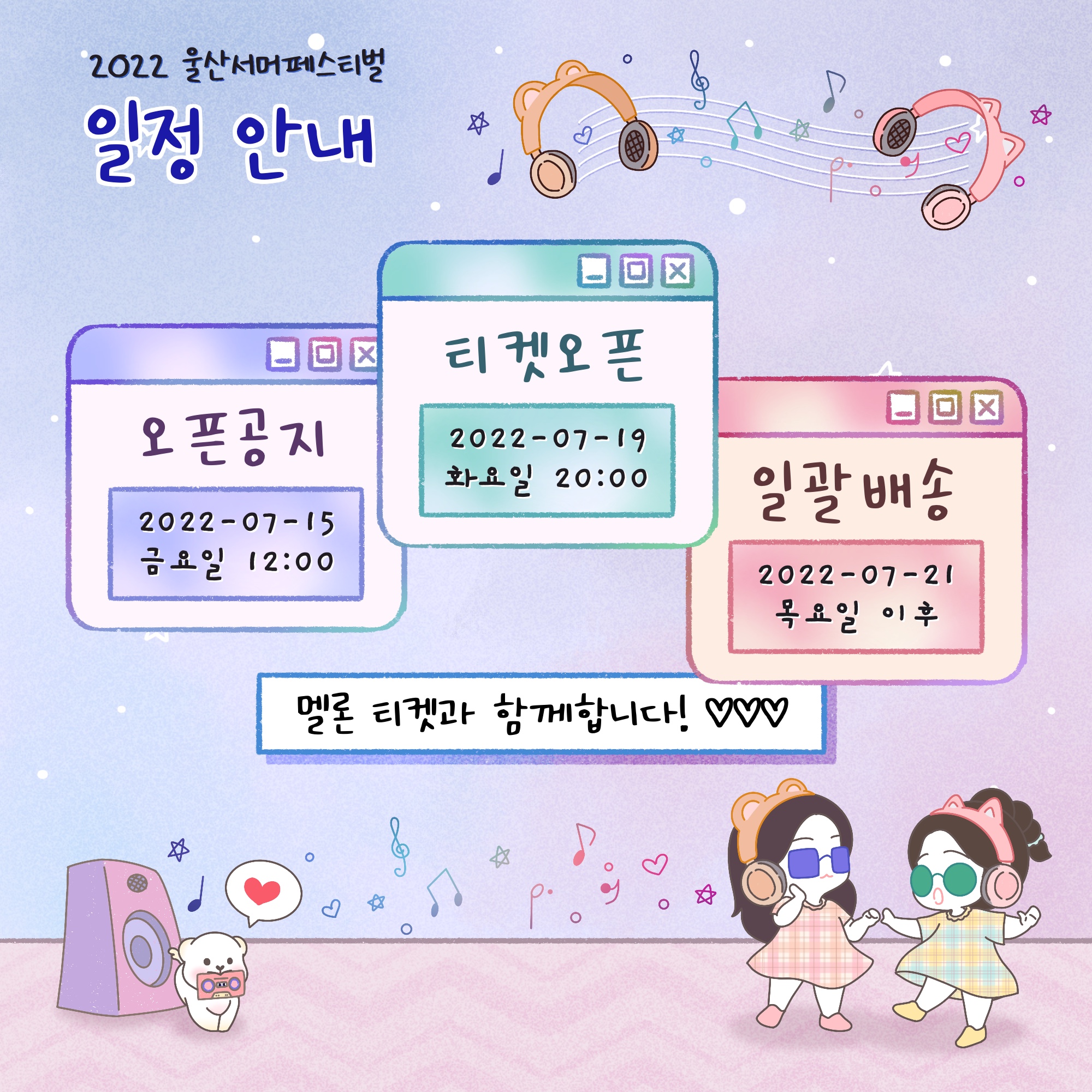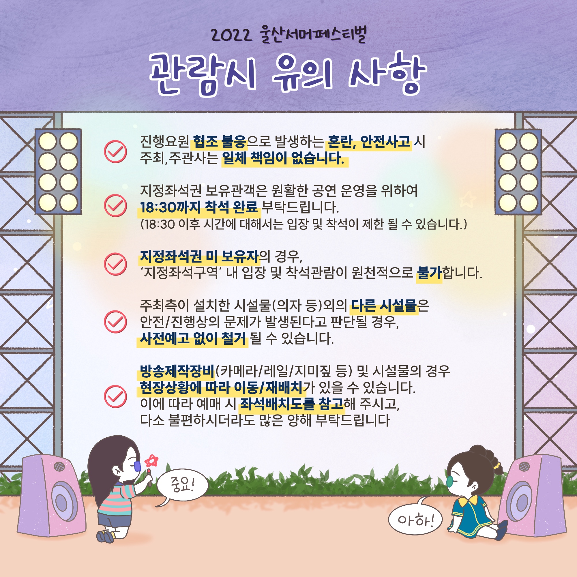 - "울산 서머페스티벌"의 모든 공연은 선착순 무료관람입니다. (단, 8월 8일 쇼!음악중심 공연은 인터넷 지정좌석 예매)