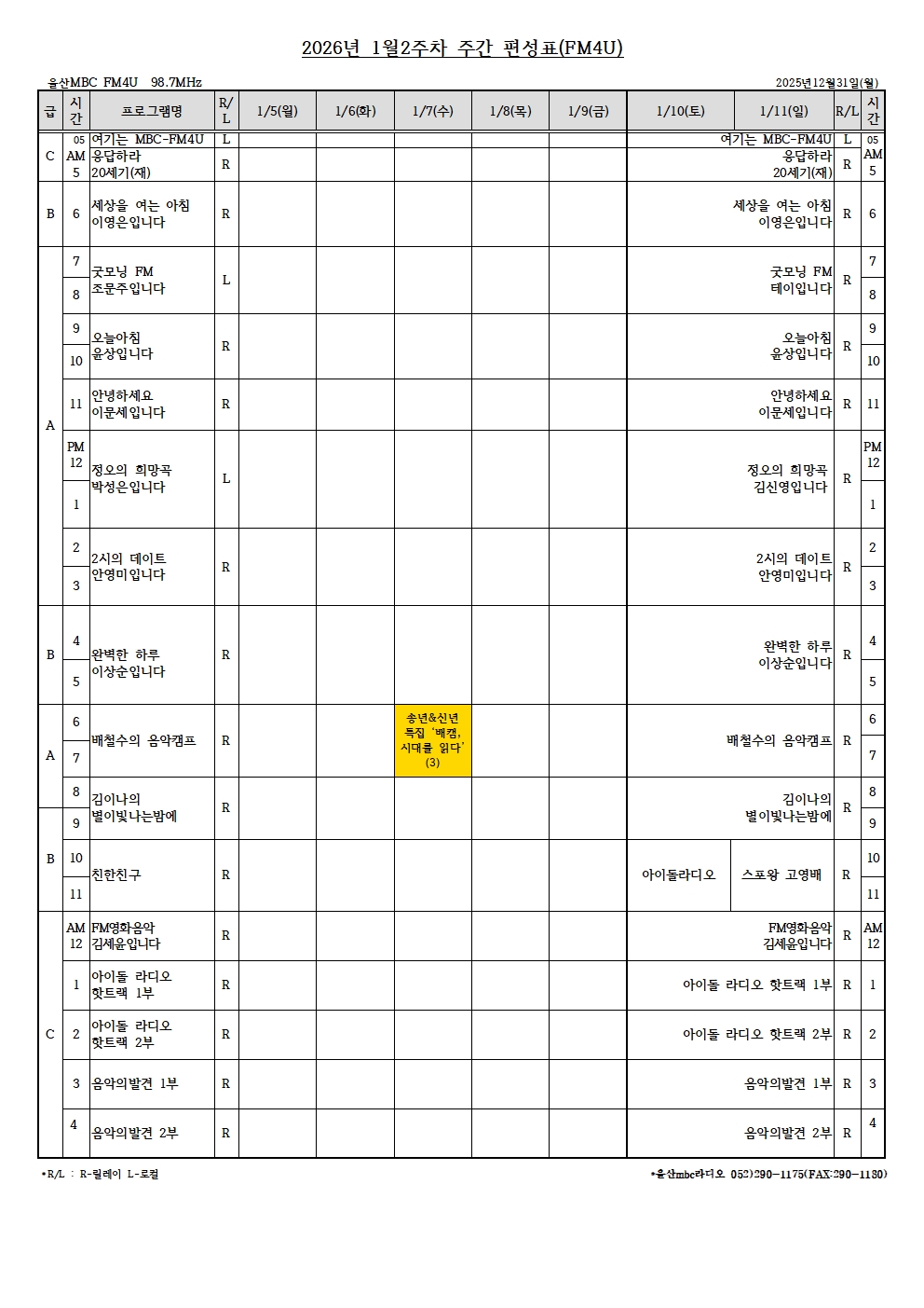 2026년 1월 2주차 주간 편성표(FM4U)