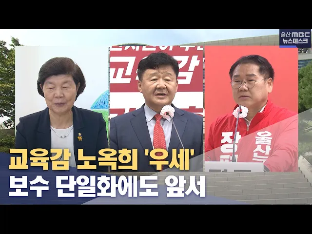 앵커 │ 이번에는 교육감 순서입니다. 노옥희 현 울산교육감 대 보수 진영 단일화 후보 간에 양자 대결을 가정한 여론 조사에서 노옥희 후보가 보수 진영 후보보다 앞서는 것으로 나타났습니다. 이용주 기자가 전해드립니다. 리포트 │ 노옥희 현 울산교육감 대 보수 진영 김주홍과 장평규 후보의 단일화를 가정해 차기 울산...
