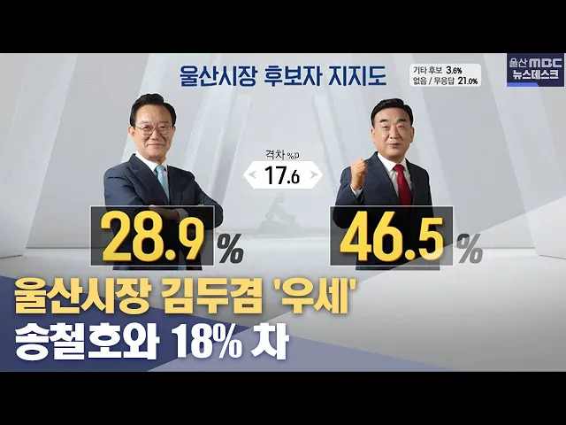 울산MBC는 시장과 교육감 후보에 이어 내일은(5/11) 각 구˙군 기초단체장에 대한 지지도 여론 조사 결과를 발표합니다. 이와 아울러 각 정당 지지도와 투표 의향 등도 함께 발표할 예정이여서 6.1 지방선거를 앞두고 지역 민심을 종합적으로 살피는 기회가 될 것으로 보입니다.