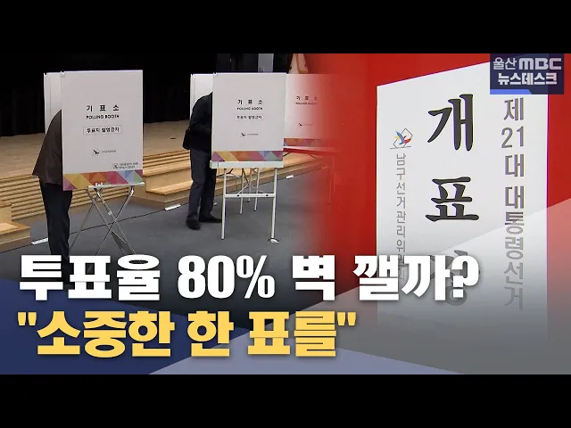 [앵커]각 정당들은 투표율이 높을수록 서로에게 유리하다며 적극적인 투표를 당부하고 있습니다. 사전투표율이 지난 대선이 미치지 못했던 이번 대선의 최종 투표율이 얼마나 될지도 관심이 모아지고 있는데요. 본 투표는 사전투표와 달리 정해진 투표소에서 오후 8시까지 할 수 있습니다. 최지호 기자. [리포트]울산은 201...