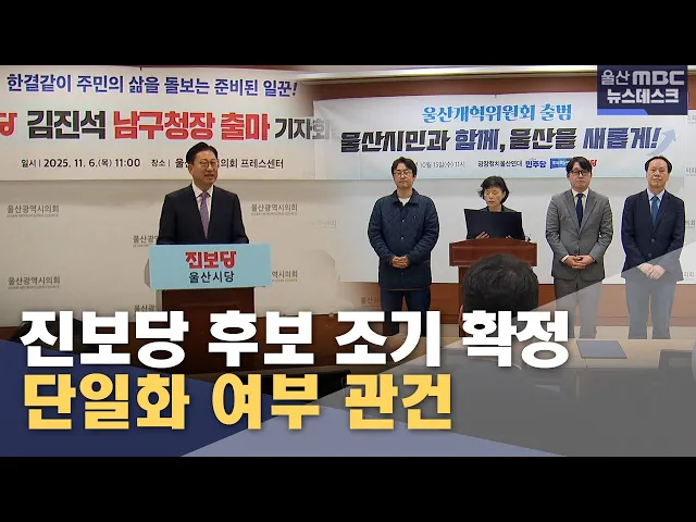 [ 앵 커 ] 내년 6월 지방선거를 앞두고 진보당이 가장 발빠르게 움직이고 있습니다. 전 선거구에 후보를 내겠다며 단체장 후보를 속속 확정하고 있는데요. 선거 연대를 약속한 더불어민주당과의 후보 단일화 여부가 최대 관심사로 떠오르고 있습니다. 조창래 기자가 취재했습니다. [ 리포트 ] 진보당 김진석 남구지역위원장...