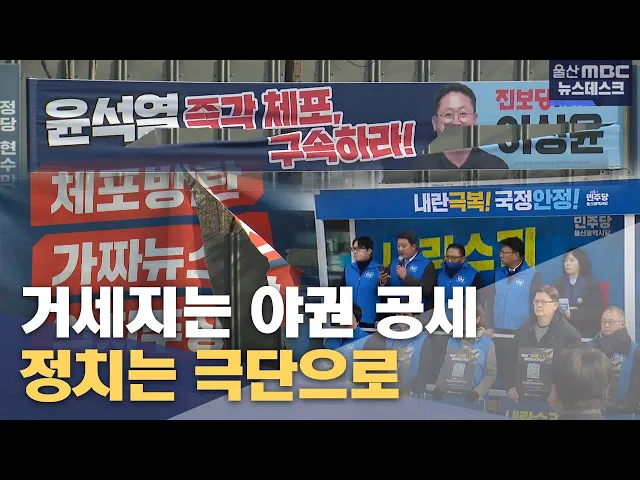 [앵커]대통령 구속과 극우세력에 의한 법원 난입 사태 이후 지역 야권의 공세가 거세지고 있습니다. 이런 가운데 국민의힘을 비판하는 내용이 담긴 현수막이 잇따라 훼손되는 등 지역에서도 정치가 극단으로 치닫고 있습니다. 조창래 기자입니다. [리포트]더불어민주당 울산시당이 울산시청 앞에서 정당연설회를 갖고 극우 ...
