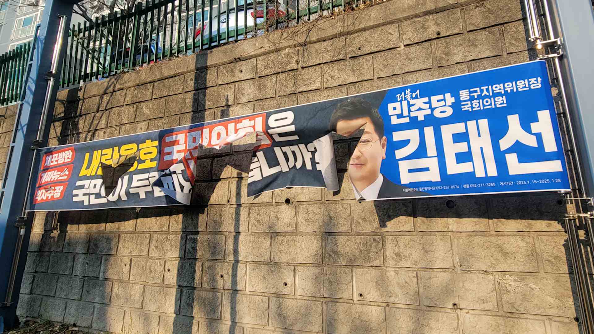 '내란옹호 국민의힘'이라는 표현을 적은 더불어민주당 김태선 의원실의 현수막이 훼손돼 경찰이 수사에 나섰습니다. 울산동부경찰서는 오늘(1/20) 오전 동구 방어동 정당 현수막 전용 게시대에 김 의원이 내걸었던 현수막이 훼손됐다는 신고를 받고 CCTV 등을 추적해 수사를 벌이고 있다고 밝혔습니다. 이에 대해 김 의원 ...