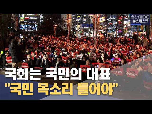 ◀ 앵 커 ▶ 대통령 탄핵소추안 표결 참여 촉구는 정치권에서만 나오는 것이 아닙니다. 울산 시민들도 일주일째 광장으로 모여 대통령 퇴진과 탄핵을 촉구하고 있습니다. 집회에 참여하지 못하는 시민들도 민의를 대변하는 국회의원들의 소신 있는 정치를 요구하고 있습니다. 정인곤 기자가 시민들의 의견을 들어봤습니다. ◀ ...
