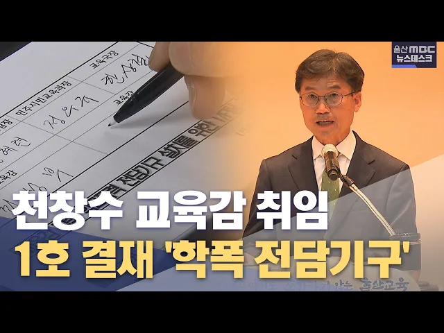 [앵커] 울산시교육감 보궐선거에서 당선된 천창수 울산교육감이 오늘(4/6) 울산시교육청으로 첫 출근해 업무를 시작했습니다. 천 교육감은 1호 결재 안건으로 '교육감 직속 학교폭력전담기구 설치안'에 서명했습니다. 이용주 기자입니다. [리포트]울산교육감 보궐선거에서 김주홍 후보에게 승리한 천창수 울산교육감이 3년 ...