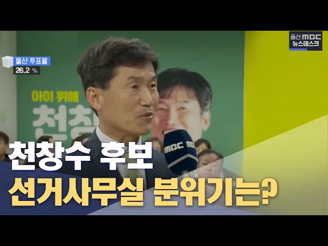 [앵커]이번 선거는 지난해 지방선거에 이어 울산교육감에 재도전하는 김주홍 후보와 부인의 교육철학을 계승한 천창수 후보의 맞대결입니다. 이번에는 천창수 후보 선거사무실로 가봅니다. 이용주 기자. 그 곳 분위기는 어떤가요? [리포트] [기자] 네 저는 지금 남구에 위치한 천창수 후보사무실에 나와있습니다. 조금 뒤부...