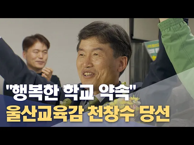 [앵커]울산 교육감 보궐선거는 진보 성향의 천창수 후보가 당선됐습니다. 천 후보는 개표 초반부터 앞서나가며 보수 진영 단일후보로 재도전한 김주홍 후보를 여유있게 따돌렸습니다. 최지호 기자입니다. [리포트]천창수 울산교육감 당선인은 개표 결과 61.94%의 지지를 얻어 38.05%를 얻은 김주홍 후보에 23.89%포인트, 5...