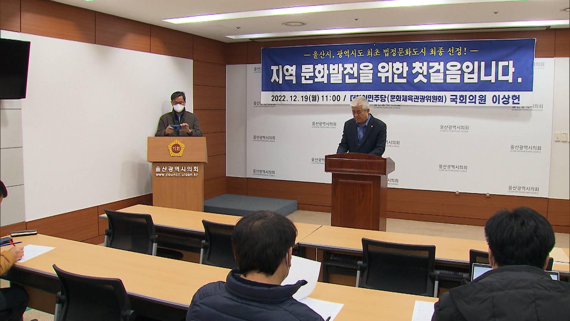 더불어민주당 이상헌 의원은 오늘(12/19) 기자회견을 열고 광역지자체 최초로 법정문화도시로 지정된 울산시가 진정한 문화관광 도시로 도약하려면 여˙야가 힘을 모아야 한다고 주장했습니다. 이 의원은 법정문화도시 선정으로 국비를 100억원 확보했지만, 더 많은 예산과 인력을 투입해 '문화도시 울산'을 기획하고 실행에...