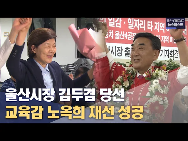 [앵커] 울산에도 보수 표심이 되살아나면서 울산시장에 국민의힘 김두겸 후보가 당선돼 4년 만에 정권 탈환에 성공했습니다. 반면 울산교육감은 보수 단일 후보의 맹추격을 따돌리고 진보 성향의 노옥희 교육감이 재선에 성공했습니다. 홍상순 기자가 보도합니다. [리포트] 울산시장에 당선된 국민의힘 김두겸 후보는 59.78...
