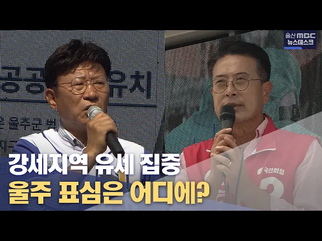 [앵커] 6.1 지방선거가 이틀 앞으로 다가오면서 선거운동 막판 열기가 뜨겁습니다. 재선에 도전하는 군수와 4년 전 선거에서 진 후보가 맞대결을 벌이는 울주군 유세 현장을 최지호 기자가 다녀왔습니다. [리포트] 유동 인구가 많은 사거리에서 마이크를 잡은 더불어민주당 이선호 후보. 울주군은 지난 20년보다 민선 7기 4...