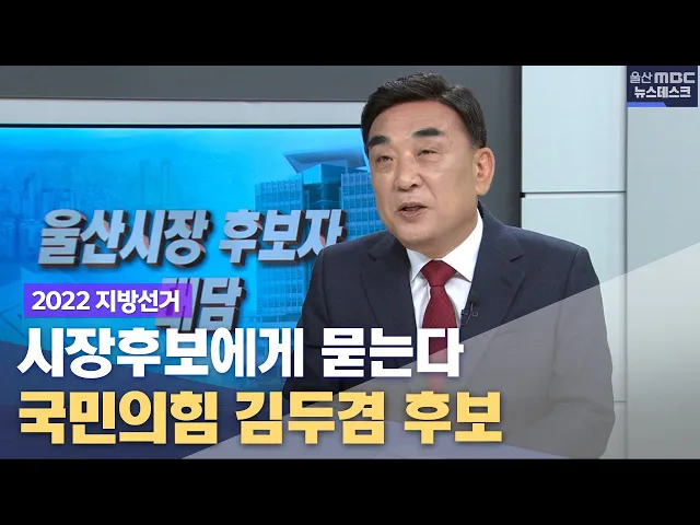 앵커| 6.1 지방선거를 앞두고 울산mbc가 마련한 울산시장 후보에게 듣는다 오늘은 국민의힘 김두겸 후보입니다. 리포트| 후보님 안녕하십니까. Q1) 얼마 남지 않은 이번 선거에서 후보님이 강조하고 있는 공약은 어떤게 있을까요? Q2) 이번 6.1 지방선거가 채 한 달도 남지 않았는데요, 울산시민들에게 꼭 하시고 싶은 말...