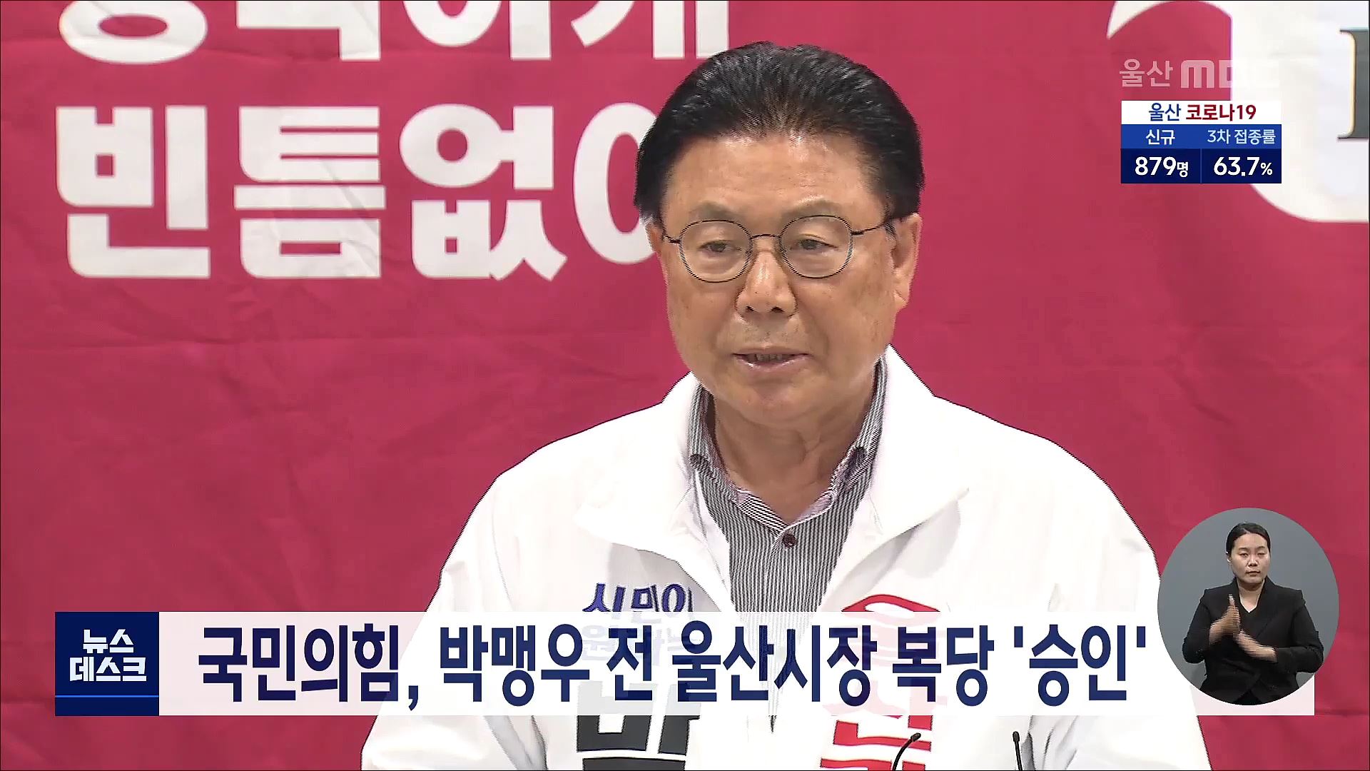 국민의힘 울산시당은 오늘(5/6) 박맹우 전 울산시장의 재입당을 승인했습니다. 시당 당원자격심사위원회는 어제(5/5) 김두겸 울산시장 후보와 보수 단일화에 합의한 박 전 시장의 복당을 만창일치로 결정했습니다.