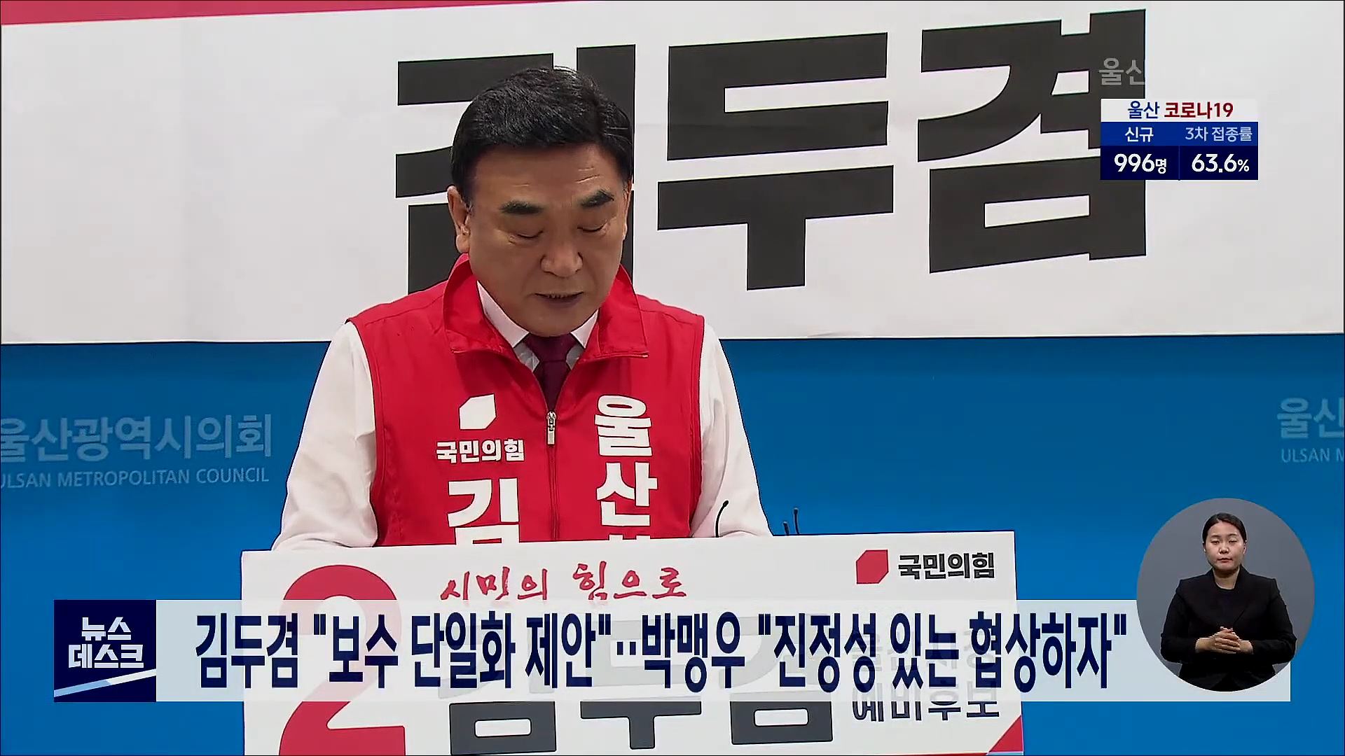 국민의힘 김두겸 울산시장 후보가 무소속 박맹우 후보가 제안한 '보수단일화 협상 제안'을 수용했습니다. 김 후보는 성명을 통해 보수 단일화 필요성을 서로 확고하게 공감하고 있는 만큼 협상에 나설 계획이라고 설명했습니다. 박맹우 후보는 김 후보 측의 제안을 환영한다며 진정성이 있다고 판단하고 협상할 것이라고 밝...
