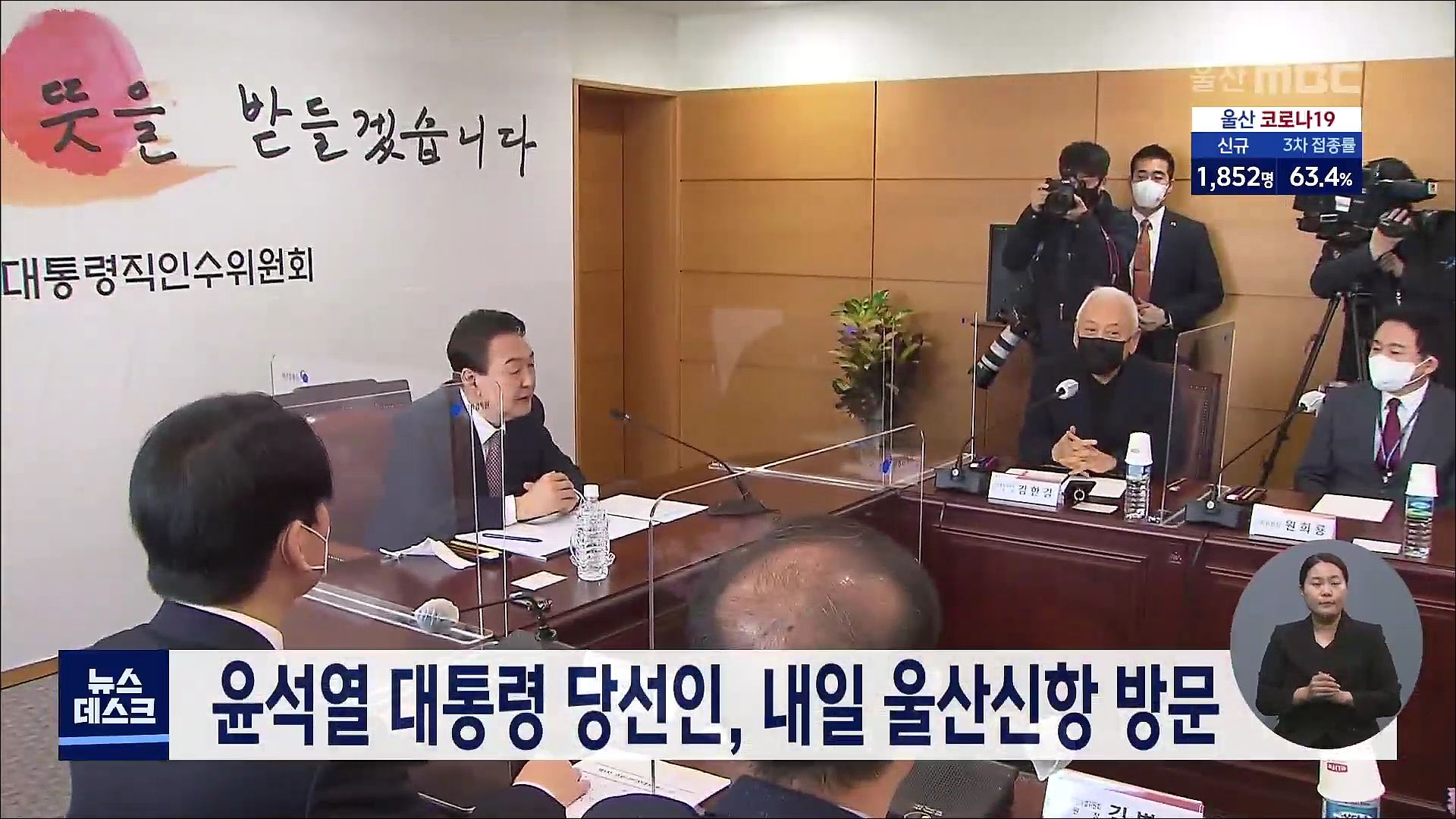 윤석열 대통령 당선인이 내일(4/22) 오후 울산 신항만을 방문합니다. 대통령직 인수위원회는 윤 당선인이 대선 이후 처음으로 울산을 방문해 동북아 오일허브 현장을 둘러보고 인수위원들과 함께 국가 에너지정책의 밑그림을 그릴 계획이라고 밝혔습니다. 한편 국민의힘 울산시장 최종 후보가 내일 중에 확정될 예정이어서 ...
