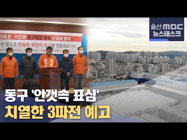 앵커| 6. 1 지방선거에서 동구는 표심을 가장 읽기 힘든 지역으로 꼽히고 있습니다. 더불어민주당과 국민의힘이 팽팽하게 세대결을 벌이는 가운데, 진보진영 단일후보가 가세하면서 치열한 3파전이 예상됩니다. 최지호 기자가 분석했습니다. 리포트| 진보당 김종훈 전 국회의원이 진보 진영 단일후보로 동구청장 도전에 ...