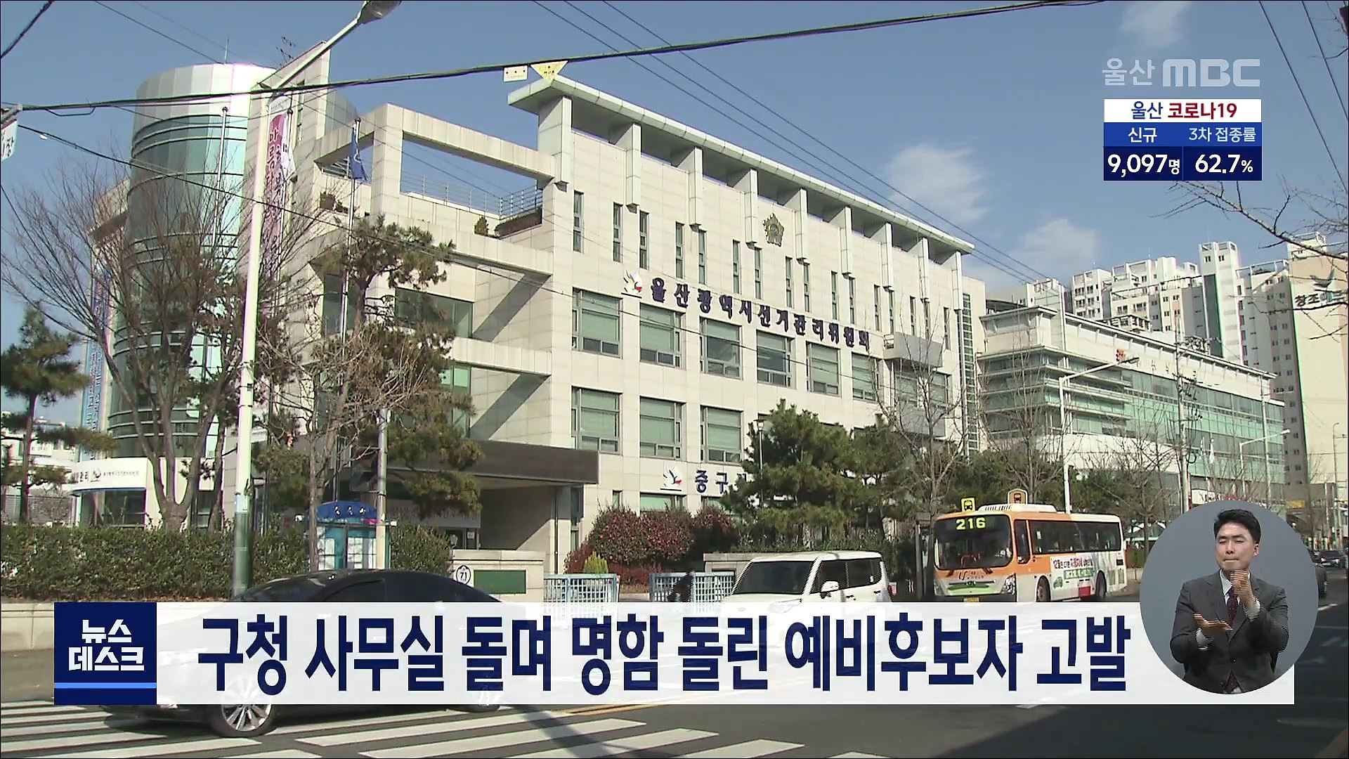 울산중구선거관리위원회는 오늘(3/29) 지방선거 예비후보자 A씨를 공직선거법 위반 혐의로 검찰에 고발했다고 밝혔습니다. A씨는 최근 울산의 한 구청 사무실을 돌며 자신의 명함을 주거나 직원 자리에 명함을 두는 방식으로 배부한 혐의를 받고 있습니다. 선거법상 예비후보자는 공개된 장소로 볼 수 없는 사무실 등을 하...