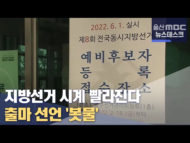 대선이 끝나면서 울산에서 6.1 지방선거 예비후보자 등록이 속도를 내고 있습니다. 울산시장 예비후보자에 국민의힘 정갑윤 전 국회부의장과 김두겸 전 남구청장이 등록했고, 중구청장 예비후보자에 국민의힘 정창화, 문병원 씨가 등록했습니다. 또 동구청장에는 국민의당 손삼호, 진보당 김종훈 씨가 등록을 마쳤고, 북구...