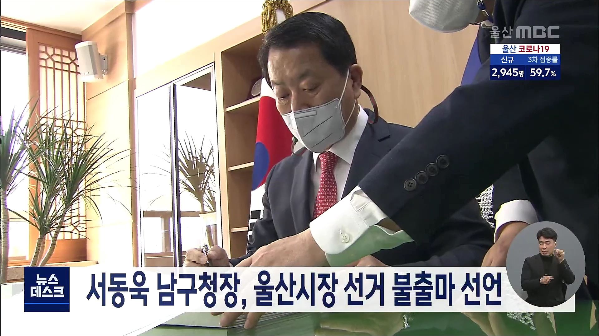 울산시장 선거 출마가 거론되던 서동욱 남구청장이 이번 시장 선거에 출마하지 않겠다는 입장을 밝혔습니다. 서동욱 청장은 자신의 SNS를 통해 자신이 중도 사퇴 후 출마하면 또 다시 남구는 행정공백에 휘말리게 된다며 좌고우면하지 않고 남구를 책임지겠다고 밝혔습니다.
