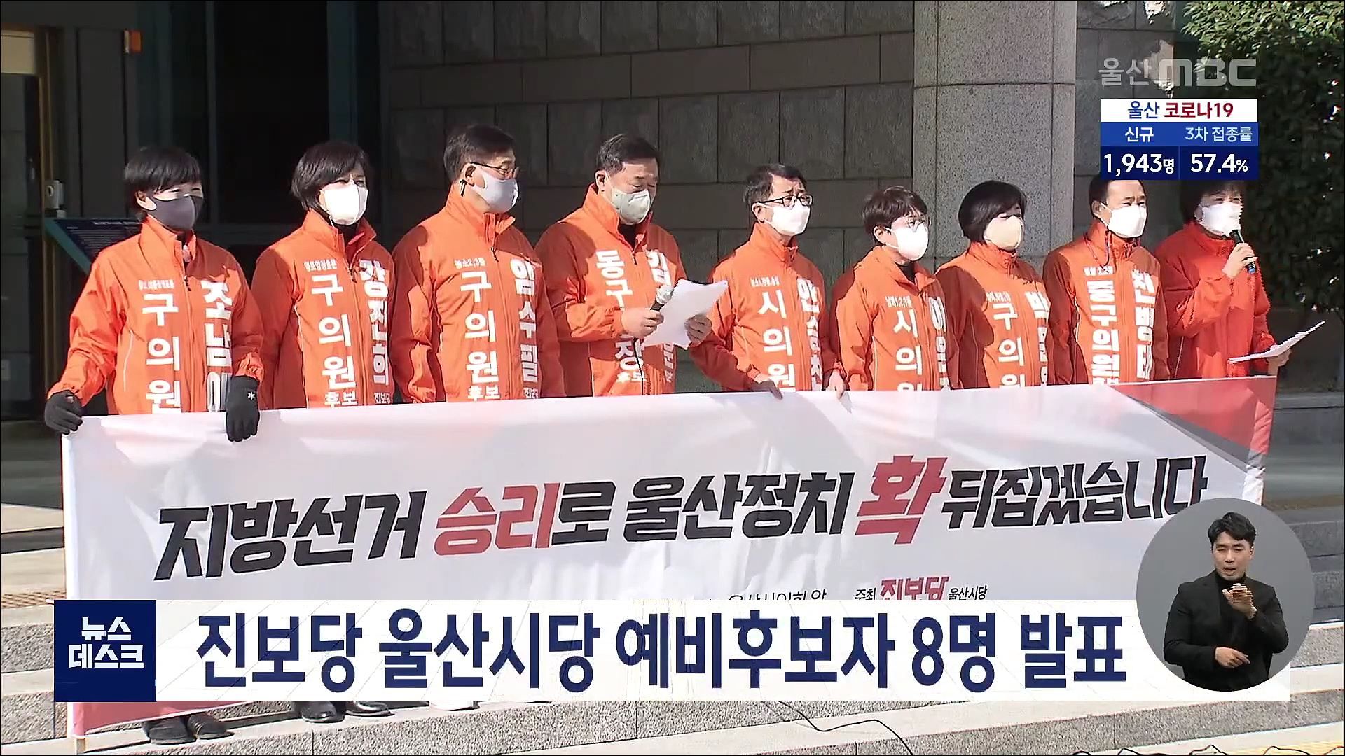 진보당 울산시당은 오늘(2/21) 울산시의회 앞에서 기자회견을 열고 지방선거 예비후보자 8명을 발표했습니다. 진보당의 예비후보자는 김종훈 동구청장 후보를 비롯해 이은주, 안승찬 시의원 후보와 박문옥, 천병태, 임수필, 강진희 구의원 후보 등 모두 8명입니다.