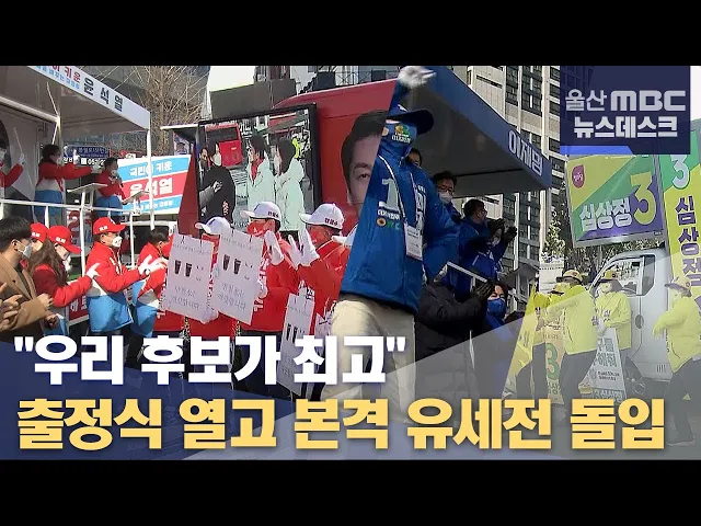 앵커 │ 대통령선거 공식 선거운동 시작일인 오늘(어제) 울산의 여야 정당들이 일제히 출정식을 열고 본격적인 선거 운동에 돌입했습니다. 각 정당마다 자신들의 후보가 최고라며 대선 승리 의지를 불 태웠습니다. 최지호 기자. 리포트 │ 울산 공업탑 로터리. 더불어민주당은 산업도시를 상징하는 공업탑을 선대위 출정식 장...