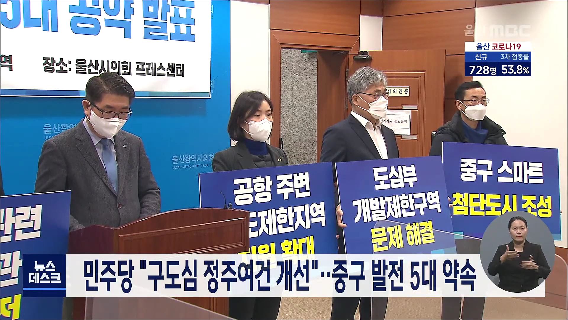 더불어민주당 중구 선거대위원회는 오늘(2/11) 울산시의회에서 기자회견을 열고 이재명 대선 후보의 중구 발전 5대 공약을 발표했습니다. 선대위는 혁신도시 공공기관 2차 이전과 고도제한지역 재산권 보상, 제2 명촌교 건설 도심 개발제한구역 해제, 첨단산업단지 조성 등으로 중구의 정주여건을 획기적으로 개선하겠다고 ...
