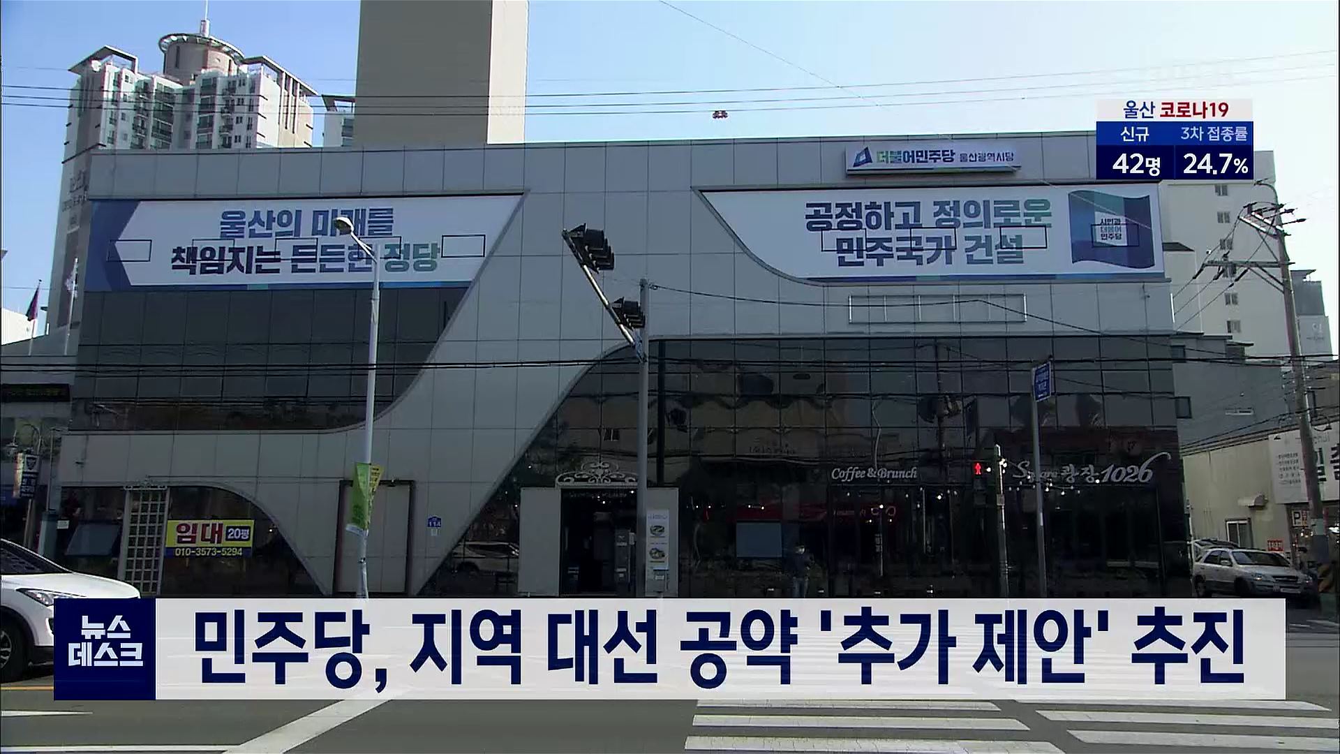 이재명 대선 후보에게 10대 공약을 전달한 더불어민주당 울산시당이 추가 공약 제안을 추진합니다. 민주당 울산시당은 무거-언양-양산으로 이어지는 광역 국가철도 신설과 울산-언양 간 고속도로 무료화, 온종일 돌봄센터 설립 등 16건의 공약 제안을 검토하고 있다고 밝혔습니다. 선대위 본부 인원을 330여 명으로 확충한 ...