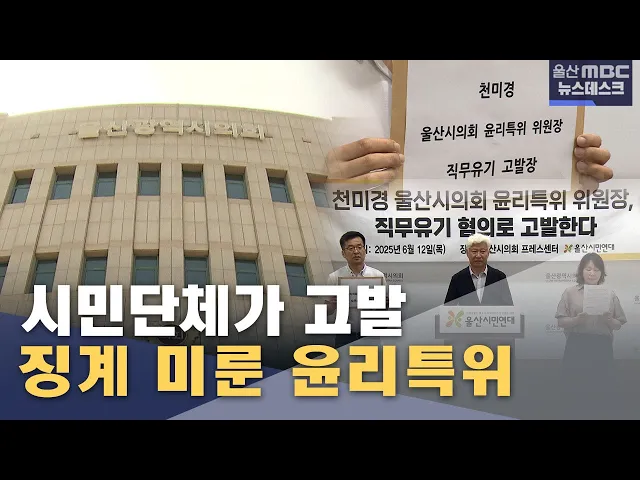 울산시민연대는 오늘(6/12) 기자회견을 열고 울산시의회 천미경 윤리위원장을 직무유기 혐의로 고발한다고 밝혔습니다. 시민연대는 임기 만료를 앞두고 있는 천 위원장이 무면허 운전으로 벌금형을 받은 홍성우 시의원에 대해 어떠한 조치도 하지 않고 있다고 지적했습니다. 이는 윤리특위 위원장이자 공무원으로서 직무 성...