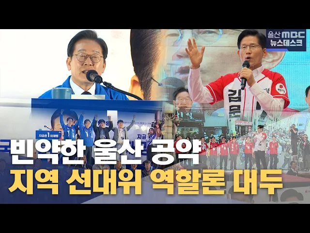 [앵커]2명의 유력 대선 주자들이 어제(5/13) 울산을 찾아 지지를 호소했습니다. 하지만 울산 관련 공약은 구체적이지 않았고, 후보 자신의 정체성 홍보와 상대 당 후보 공격에만 집중해 아쉬움을 남겼습니다. 조창래 기자가 분석했습니다. [리포트]더불어민주당 이재명 후보는 전 정권의 지난 3년간 이 나라가 어떻게 됐는...