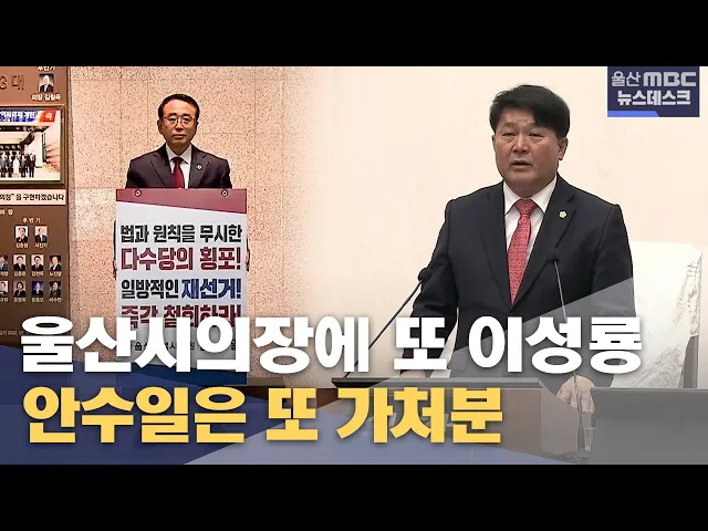 [앵커]이성룡 의원이 울산시의회 후반기 의장으로 다시 선출됐습니다. 결국 돌고 돌아 9개월 전 상황으로 다시 돌아간 건데, 의장 자리를 두고 경쟁을 벌여 온 안수일 의원은 이번에도 효력 정지 가처분 소송을 제기했습니다. 조창래 기자가 취재했습니다. [리포트]울산시의회 후반기 의장을 뽑는 선거가 9개월 만에 다시 ...
