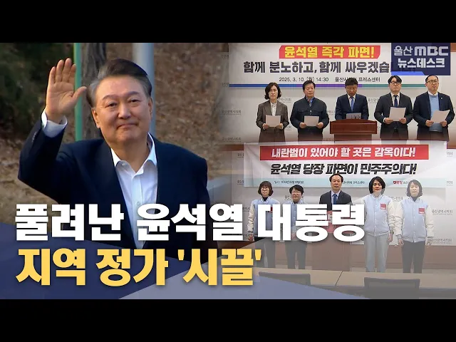울산지역 야당과 시민단체들은 오늘(3/10) 릴레이 기자회견을 열고 윤석열 대통령에 대한 즉각 파면을 촉구했습니다. 또 법원의 구속 취소 결정을 수용하고 즉시 항고를 포기한 검찰을 두고는 스스로 내란 공범임을 선언한 것이라고 주장했습니다. 이들은 윤석열 대통령이 파면될 때까지 매일 오후 6시 30분 남구 삼산동 롯...