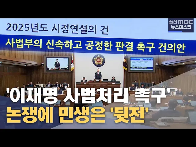 울산시의회가 오늘(2/12) 올해 첫 임시회를 열고 더불어민주당 이재명 대표에 대한 사법부의 신속한 판결을 요구하는 촉구 건의안을 채택했습니다. 새해 첫 안건으로 이재명 판결 촉구 건의를 상정한 울산시의회는 국민의힘 소속 시의원 19명과 무소속 의원 1명의 찬성으로 더불어민주당 소속 의원 2명의 반대한 건의안을 ...