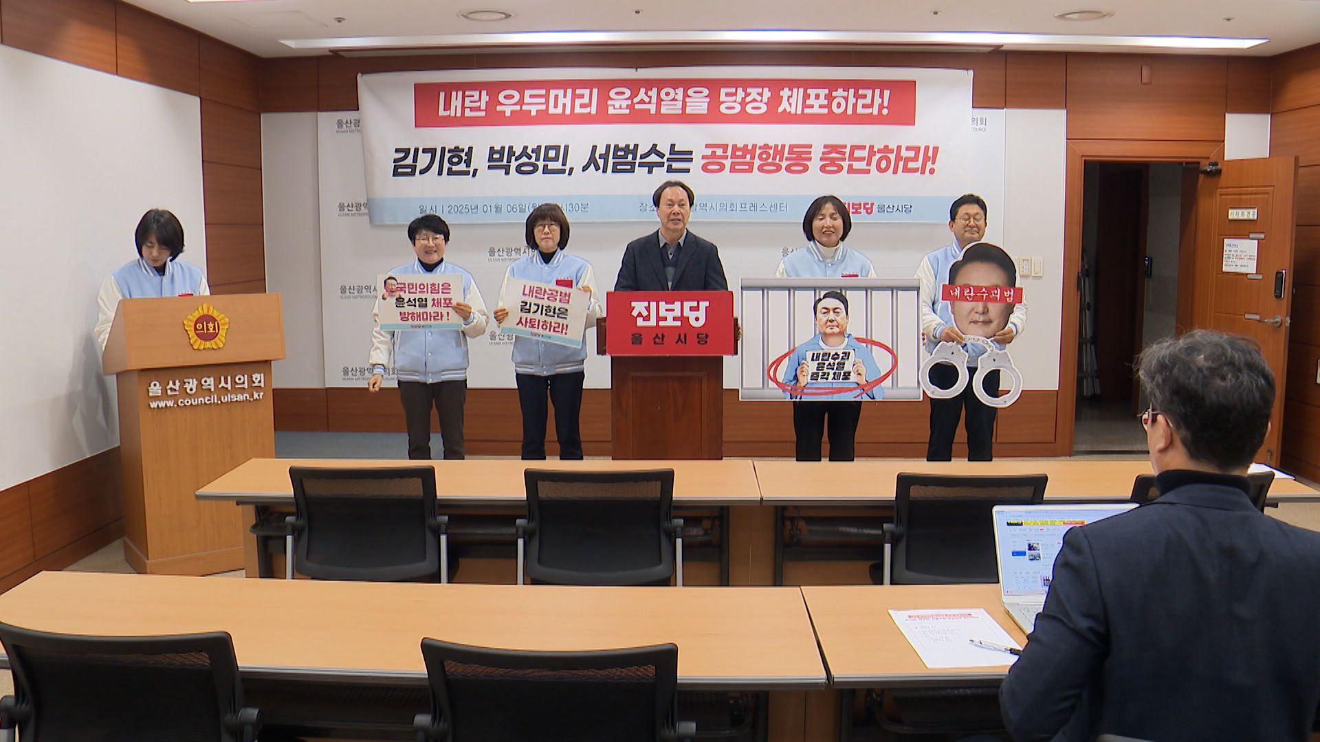[ 앵 커 ]윤석열 대통령에 대한 체포 영장 집행을 둘러싼 논란이 갈수록 커지는 가운데 울산 지역 국민의힘 정치인들이 대통령 지키기에 본격적으로 나서고 있습니다. 전면에 나선 국민의힘 의원들과 간접 지원에 나선 시장을 향해 야권과 시민단체가 내란 공범 행위를 멈추라고 촉구하고 나서며 지역 정치권의 공방도 달아...