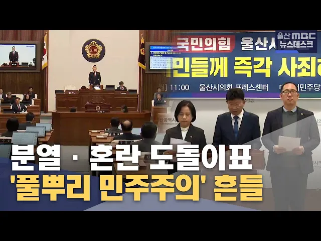 [앵 커 ] 국민의힘 내부 분열로 우려됐던 울산시의회 파행과 혼란이 유례없는 후보 동반 사태로 되풀이 되게 됐습니다. 유력 정치인의 입김에서 자유롭지 못한 모습까지 다시 한번 내비치며 풀뿌리 민주주의 근간이 흔들리고 있다는 지적도 나오고 있습니다. 조창래 기자가 취재했습니다. [리포트] 울산시의회 의장 선거에 ...