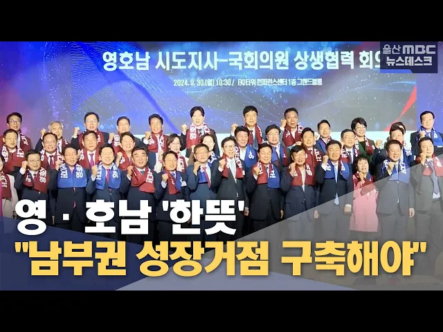 [앵 커 ] 영·호남 시도지사와 국회의원이 한자리에 모여 국토 균형 발전을 위한 남부권 성장거점 구축에 뜻을 모았습니다. 기울어진 균형을 회복하기 위해 입법과 예산, 권한을 지방으로 나누는 방안을 정부에 지속적으로 요구할 계획입니다. 정인곤 기자 [리포트] 울산과 부산, 대구, 광주. 경상남북도와 전라남북도까지 ...