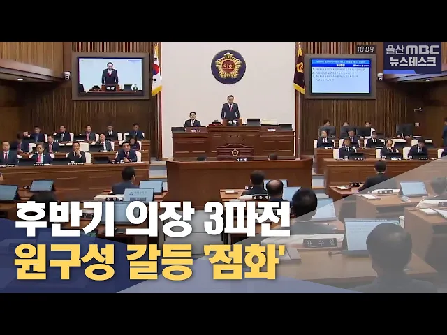 ◀ 앵 커 ▶ 여소야대인 국회와 달리 울산시의회는 의석 대부분을 국민의힘이 차지하고 있습니다. 때문에 원구성에 난항을 겪는 국회와 달리 의장단 선출이 순조로울 것으로 보였지만 정작 여권 내부 경쟁이 어느 때보다 치열합니다. 최지호 기자. ◀ 리포트 ▶ 민선 8기 울산시의회 전반기 마지막 정례회. 여러 안건들 가운데 ...