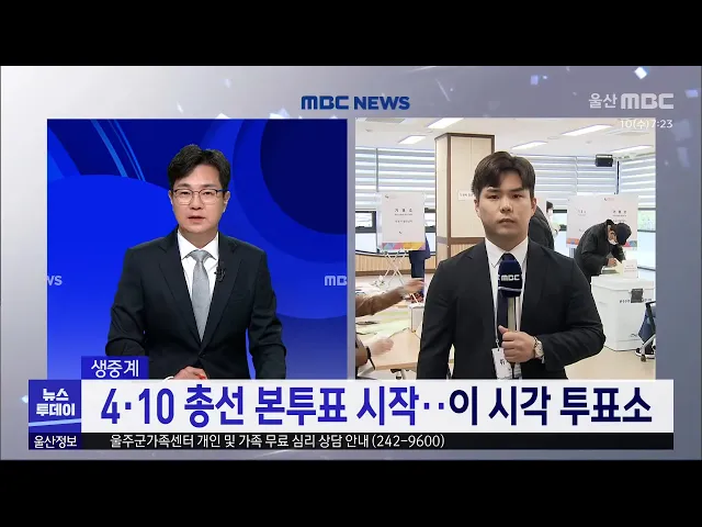 [앵커]제22대 국회의원 선거 투표가 조금 전 오전 6시부터 울산지역 269개 투표소에서 일제히 진행되고 있습니다.중구 학성동 제1투표소인 학성동 행정복지센터를 연결해 이 시각 투표 상황 알아보겠습니다. 정인곤 기자. 투표소 상황 전해주시죠. [기자]네, 저는 지금 제22대 국회의원 선거 투표가 진행 중인 중구 학성동 ...