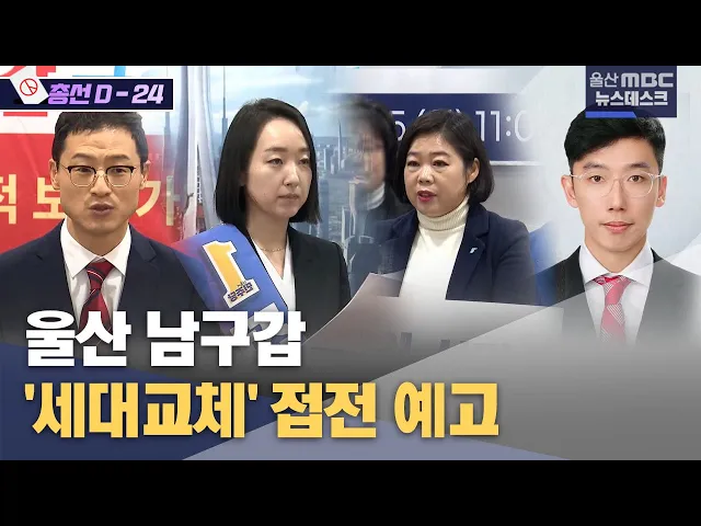 [ 앵 커]4.10총선이 24일(23일) 앞으로 다가왔습니다.당내 경선을 통과하고 본선에 오른 후보들을 살펴보는 순서, 오늘(3/17)은 가장 늦게 대진표가 결정된 남구갑입니다.민주당은 인재영입, 국민의힘은 국민추천을 통해 세대교체를 시도한 가운데, 새로운미래당 후보까지 더해 접전이 예상됩니다. 최지호 기자.[ 리포트]기...