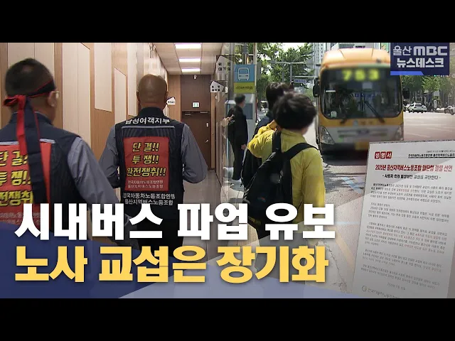[앵 커] 울산 시내버스 노조가 당분간 파업을 보류하기로 하면서 출퇴근길 교통 대란은 빚어지지 않았습니다. 노사는 기본급과 정기 상여금에서는 이견을 좁혔지만, 퇴직금을 둘러싼 입장차가 커 타결까지 상당한 진통이 예상됩니다. 최지호 기자. [리포트] 시내버스 노사가 다음 달 5일까지 교섭 마감 시한을 연장하기로 ...