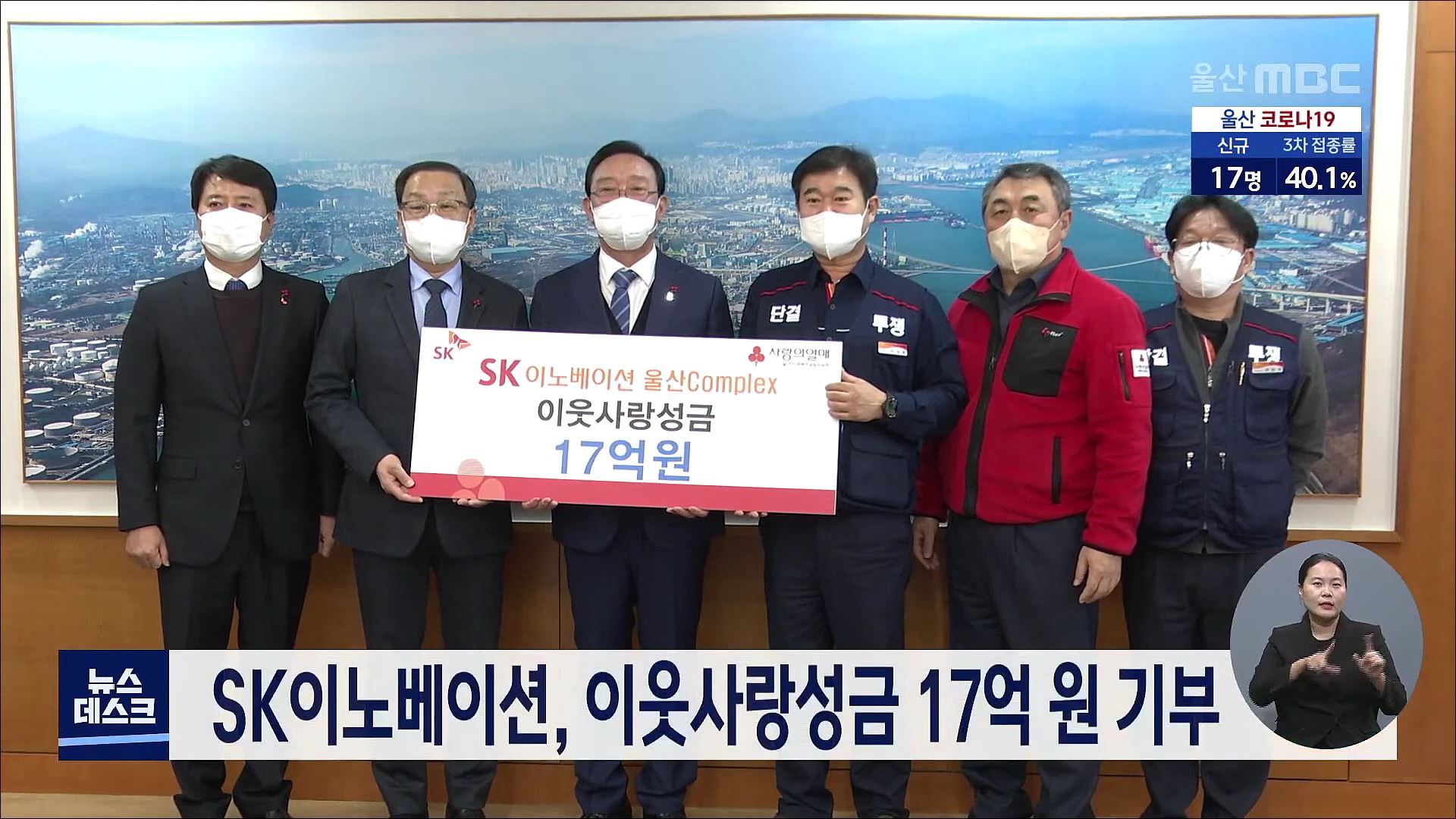 SK이노베이션 울산콤플렉스는 오늘(1/14) 시청을 찾아 저소득층 등 취약계층을 위해 써달라며 17억 원을 전달했습니다. 이 성금은 회사 임직원이 기본급의 1%를 자발적으로 기부해 조성된 14억 원과 회사가 낸 기부금 3억 원으로 마련됐습니다.