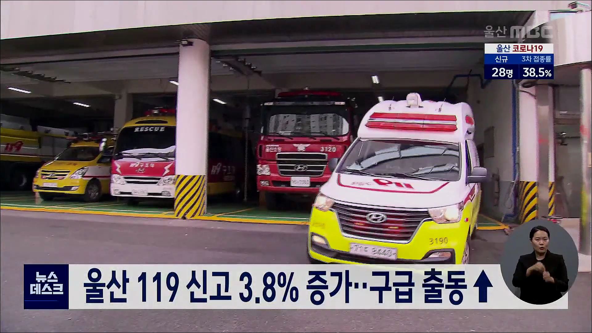 울산지역은 지난해 119 신고가 모두 23만 6천52건으로 전년보다 3.8% 증가한 것으로 나타났습니다. 이 가운데 화재, 구조·구급 등 출동 관련 신고가 6만 8천여 건으로 특히 코로나19로 인한 구급 신고가 10.2% 증가한 것으로 집계됐습니다. 월별로는 벌집 제거 등 생활 안전 관련 신고가 집중되는 여름철이 가장 많았습니다...