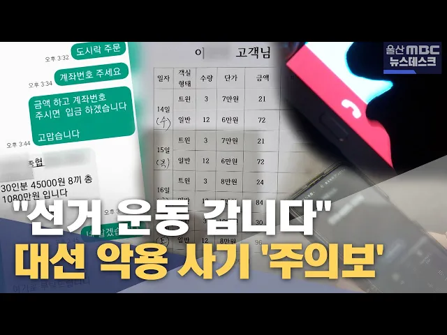 [앵커]대선 국면을 악용해 정당 관계자를 사칭한 사기 행각이 전국에서 잇따르고 있습니다. 울산의 한 숙박업소에서도 대선캠프 관계자를 사칭한 보이스피싱으로 수백만원을 뜯기는 사건이 발생해 경찰이 수사에 나섰습니다. 정인곤 기자 [리포트]울산 남구의 한 숙박업소. 지난 12일 국민의힘 홍보실장이라는 사람으로부터...