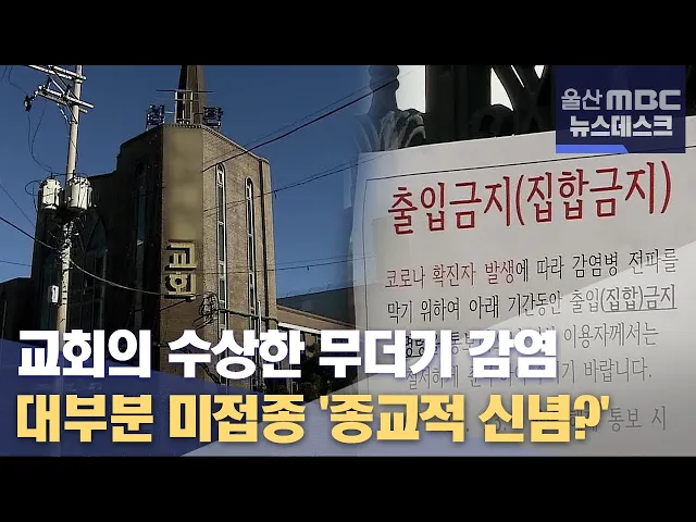◀ANC▶울산의 한 교회에서 목사를 포함해 교인 수십 명이 코로나19에 무더기 확진됐습니다. 대다수의 교인들이 질병 치료를 위해 교회에서 공동생활을 했으며, 예방 접종을 하지 않은 것으로 조사됐습니다. 방역당국은 종교적 신념을 미접종의 원인으로 의심하고 있습니다. 정인곤 기자.◀END▶◀VCR▶울산의 한 교회 ...