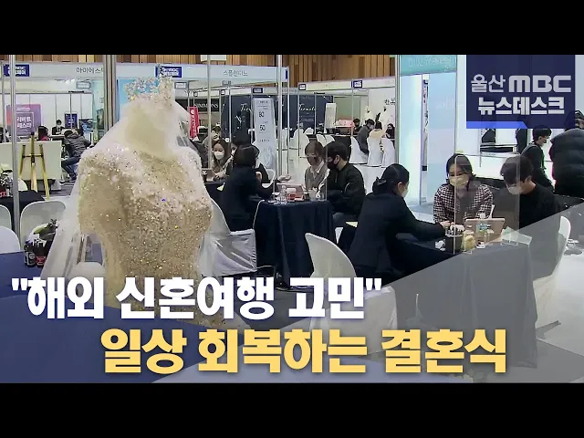 ◀ANC▶코로나19 여파로 지난해에는 결혼식도 많이 줄어들었는데요.위드 코로나와 함께 오랜만에 열린 웨딩 박람회에는 많은 예비 부부들이 찾아왔습니다.백신접종으로 가능해진 해외 신혼여행을갈 지 말 지, 고민하는 예비 부부들도 늘고 있습니다.정인곤 기자.◀END▶◀VCR▶울산 전시컨벤션센터에서 진행된 결혼박람...