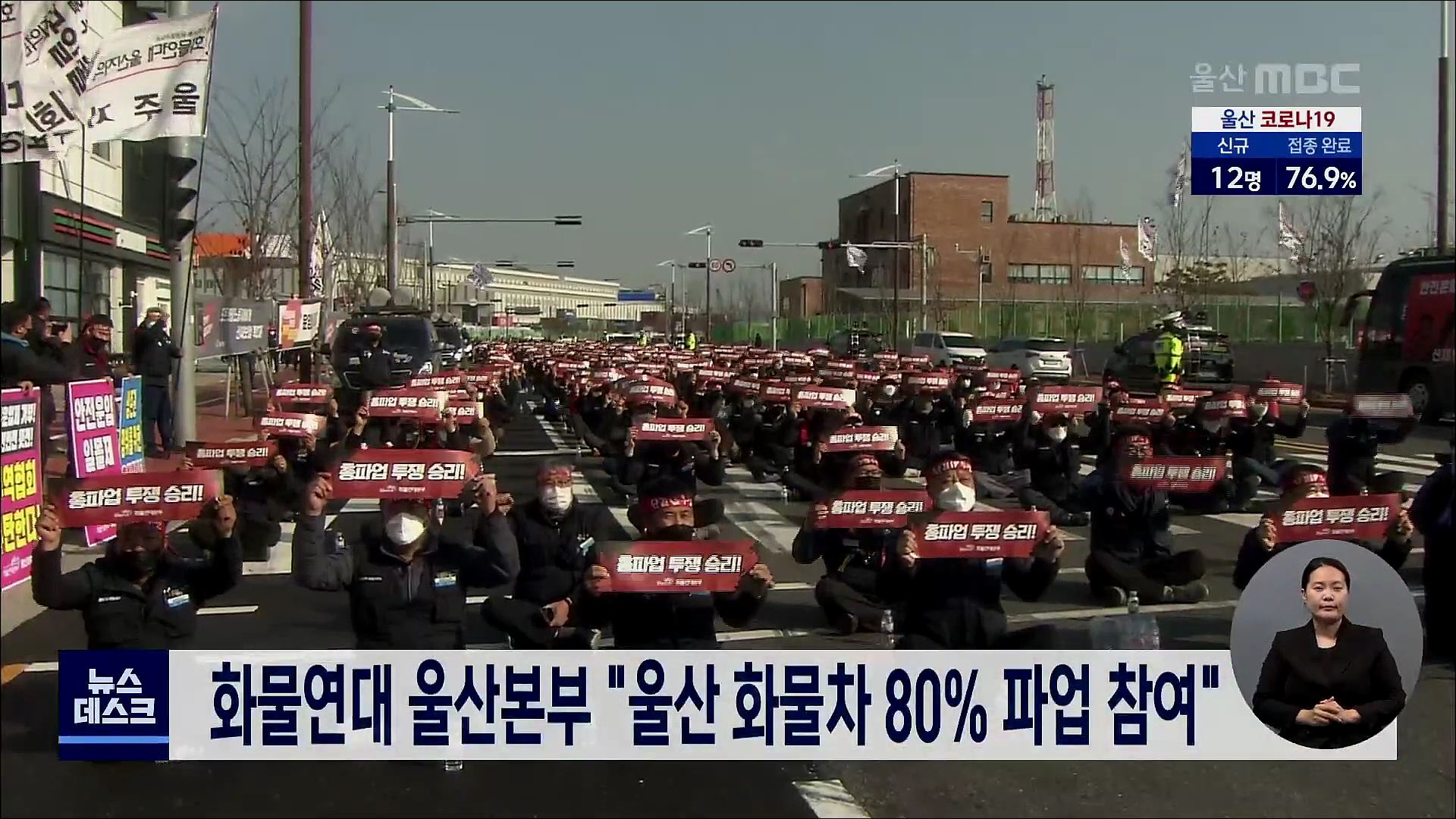 민주노총 전국공공운수노동조합 화물연대가 오늘(11/25)부터 사흘간 총파업에 돌입합니다. 화물연대 울산본부는 울산에서 운행하는 4천여 대의 화물차 가운데 80% 정도가 이번 파업에 참여한다고 밝혔습니다. 노조는 화물차에 일정 수준의 운임을 보장하는 화물안전운임제를 확대 시행할 것을 요구하고 있습니다.