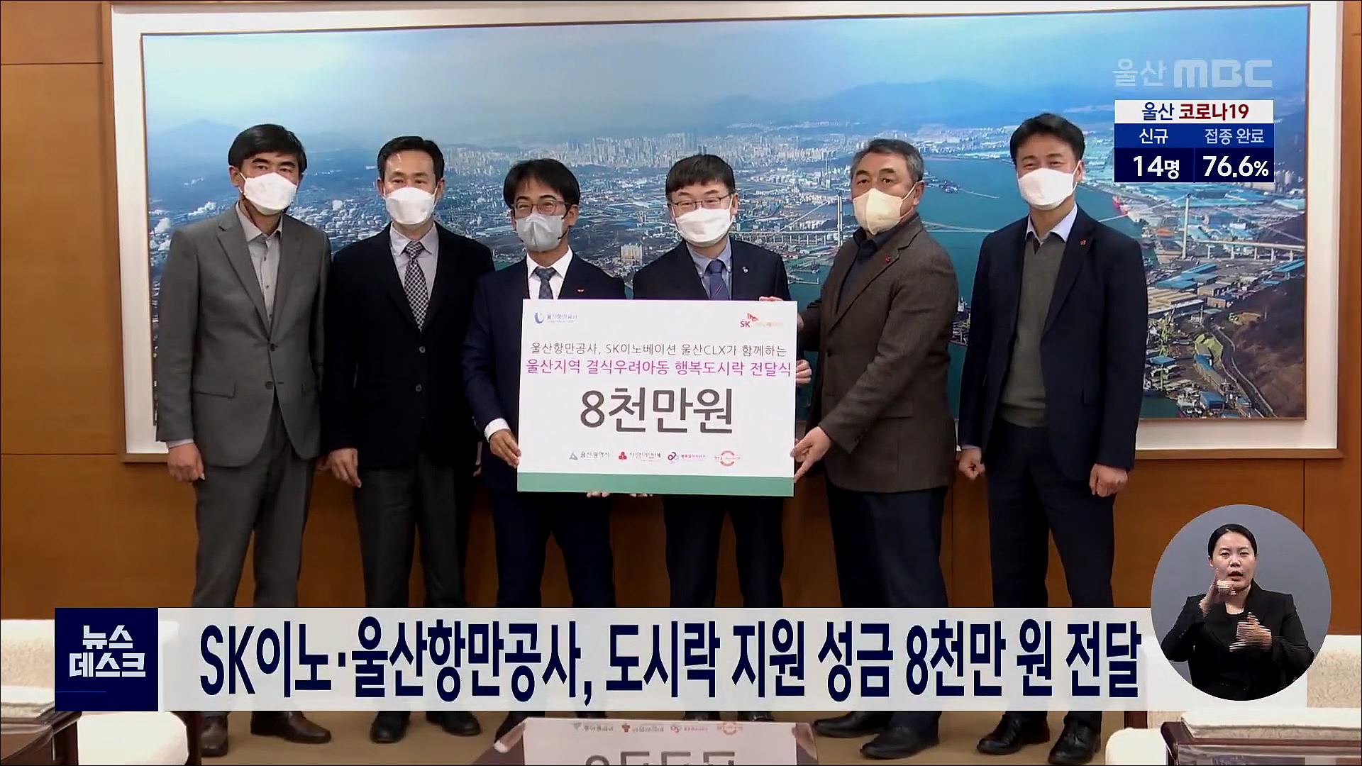 SK이노베이션과 울산항만공사는 오늘(11/23) 시청을 찾아 결식우려 아동 도시락 지원을 위한 성금을 전달했습니다. SK이노베이션은 6천 만원을, 울산항만공사는 2천 만원을 각각 기부했습니다. 울산시는 이 기부금으로 아동 200명에게 주 1회 밑반찬과 과일을 전달할 계획입니다.