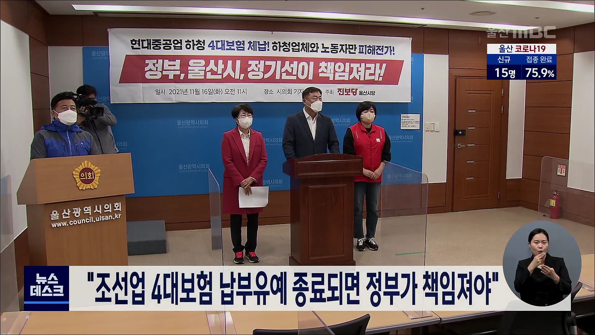 동구 고용위기지역 지정으로 조선업 하청업체들이 현재 받고 있는 4대 보험 납부유예 조치를 정부가 책임져야 한다는 주장이 나왔습니다. 진보당 울산시당은 올해 말 동구가 고용위기지역 지정에서 해제될 경우 그 동안 유예됐던 4대보험 체납분이 한꺼번에 하청업체와 노동자들에게 강제징수된다며 현대중공업과 정부, 울...