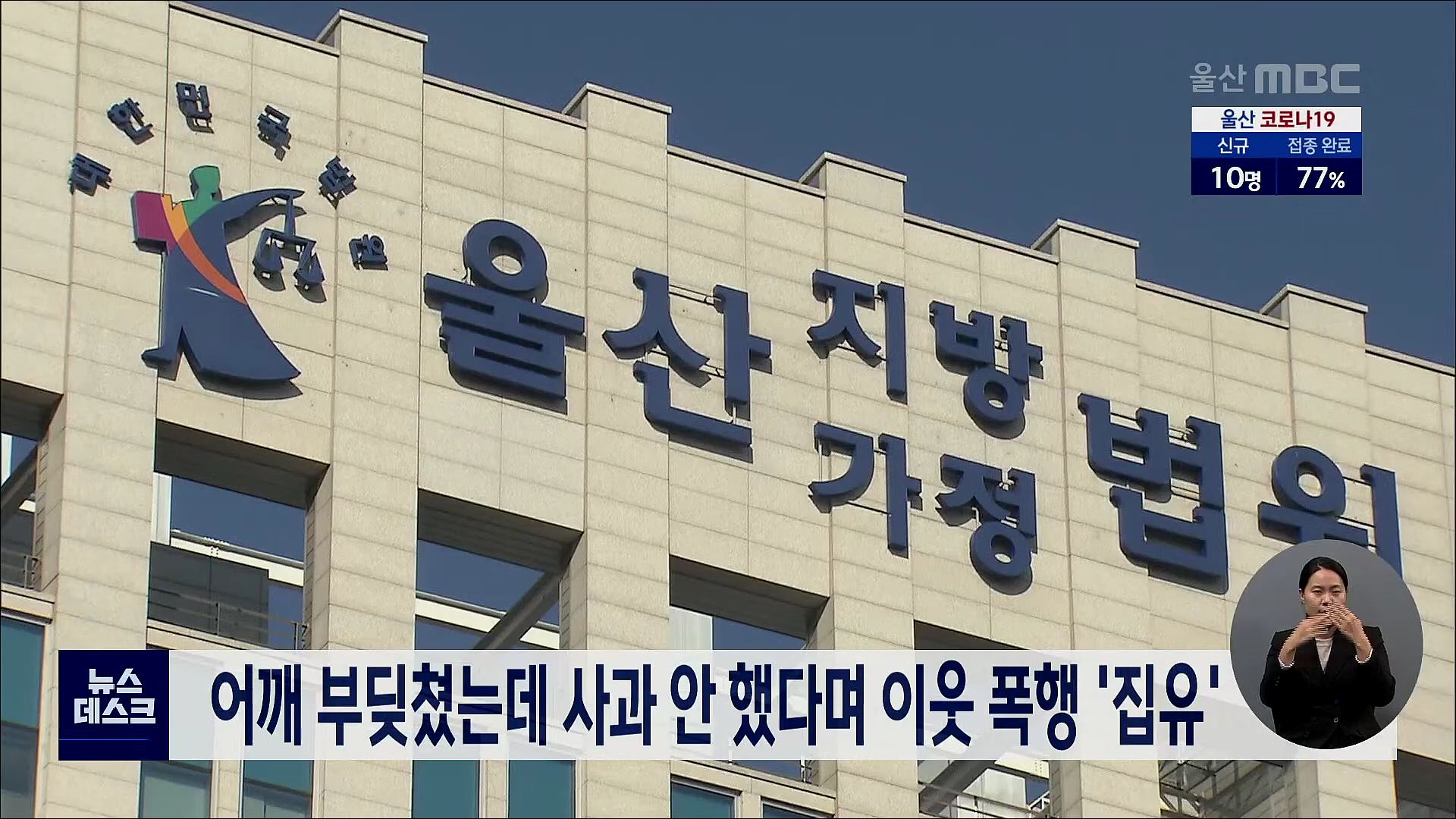 울산지법은 아파트 이웃을 폭행해 전치 6주 부상을 입힌 30대 남성에게 징역 1년에 집행유예 2년을 선고했습니다. 이 남성은 지난 2월 엘리베이터를 타면서 이웃과 어깨를 부딪쳤는데, 당시 사과를 받지 못한 것에 앙심을 품고 있었다가 이날 흡연장에서 이웃과 마주치자 시비를 걸고 폭행한 것으로 드러났습니다.