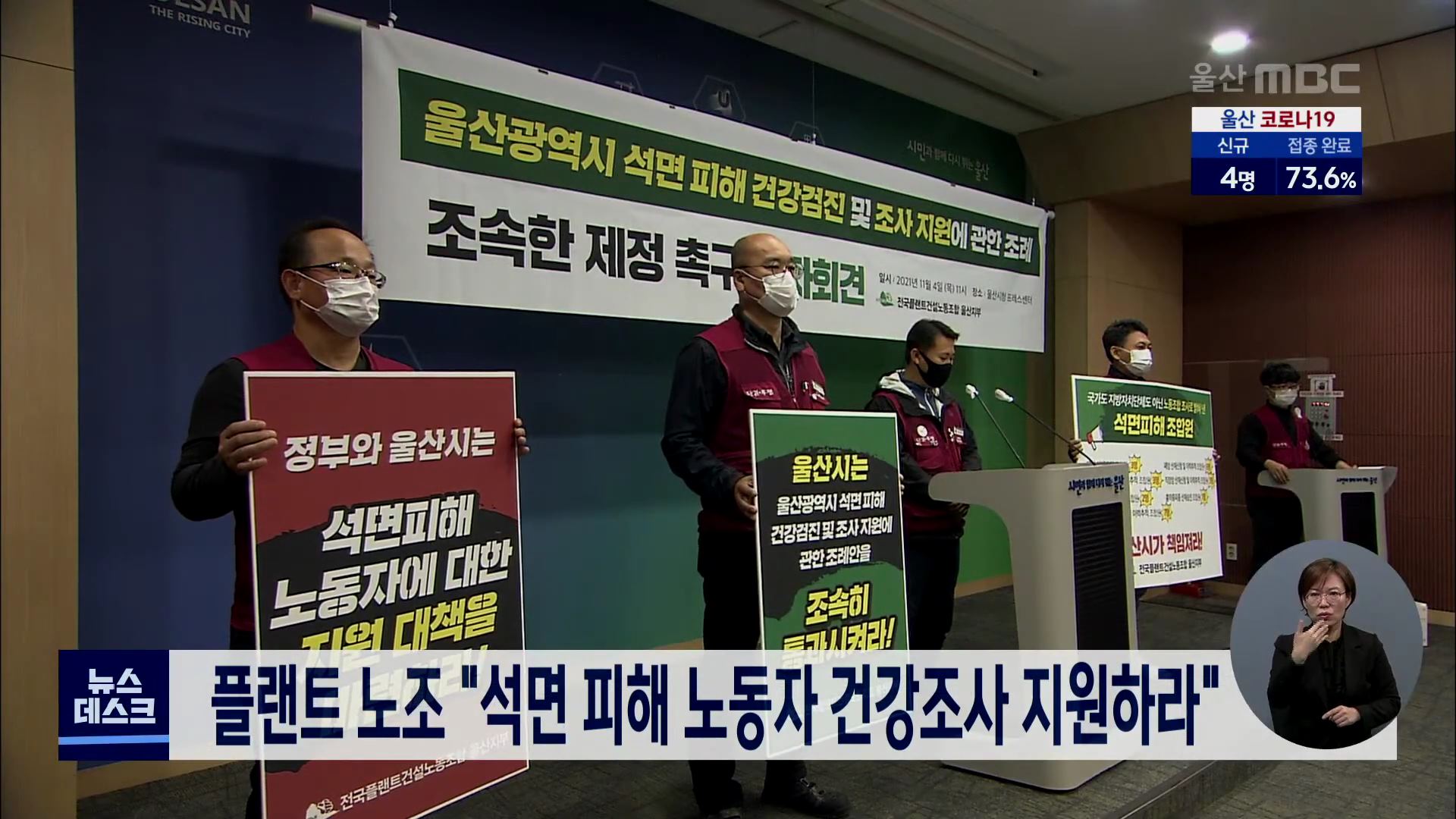 전국플랜트건설노조 울산지부는 오늘(11/4) 시청 프레스센터에서 기자회견을 열고 플랜트 건설 노동자들의 석면 피해와 관련된 건강영향조사를 지원할 조례 제정을 촉구했습니다. 이들은 1급 발암물질인 석면이 지난 2009년 사용 금지되기 전까지 석유화학 플랜트 현장에서 광범위하게 사용돼 노동자들의 피해가 계속되고 ...